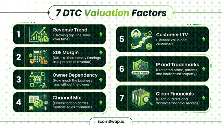 Here is a practical summary of what each factor is worth in multiple terms for a DTC brand in the $1M to $5M SDE range: