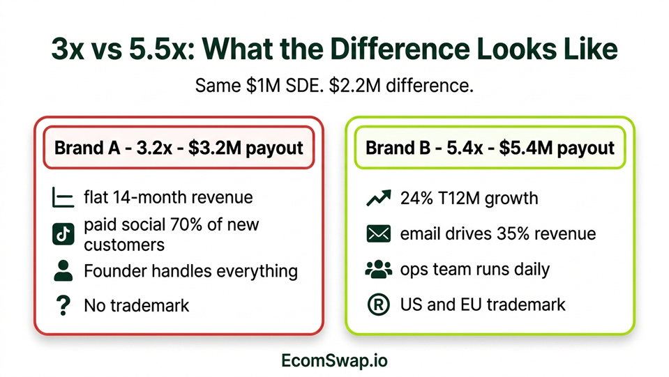 Brand A closes at 3.2x for $3.2M. Revenue has been flat for 14 months. The founder runs the supplier relationship personally and manages all creative direction. 70% of new customer revenue comes from Meta ads with no Klaviyo flows generating meaningful revenue. No trademark filed. P&Ls are spreadsheet-based with no bookkeeper reconciliation.