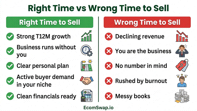 The question “when to sell my ecommerce business” does not have a universal answer. But it does have a framework. This guide lays out the five signals that consistently indicate a founder is in the right position to sell, the three signs that tell you it is not the right time yet, and what to do in each scenario.